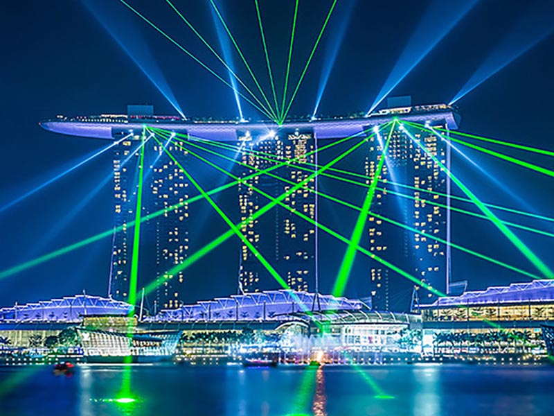 Urban Lighting: Blendende visuelle Effekte wie Punkte, Linien, Grafiken und Text mit Lasern am urbanen Nachthimmel präsentieren.