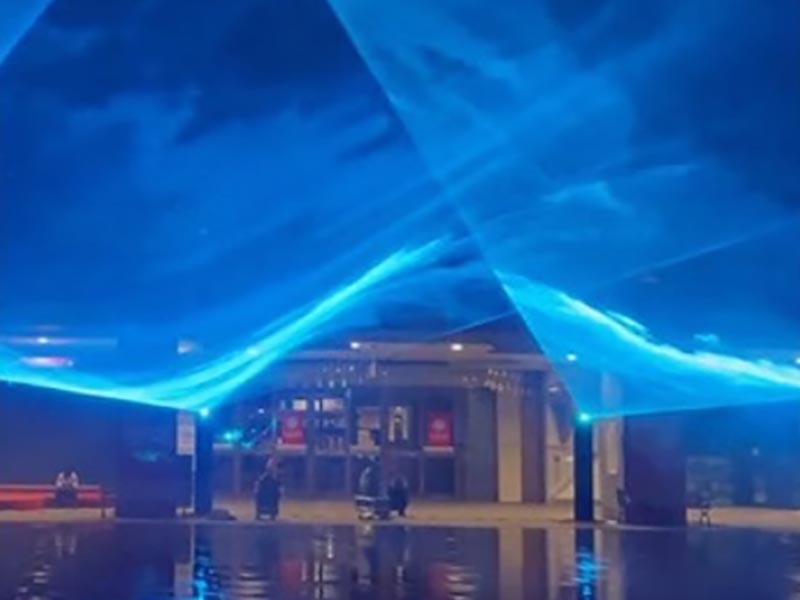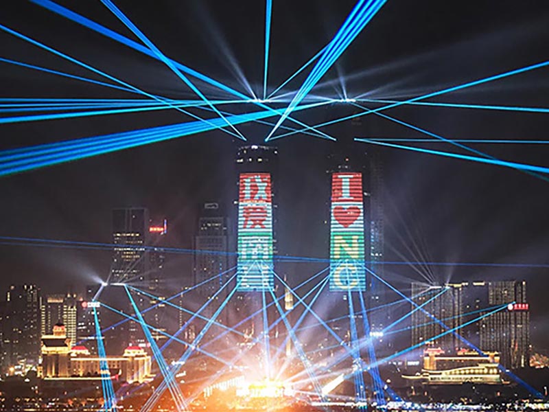 Urban lighting: presenting dazzling visual effects such as dots, lines, graphics, and text in the urban night sky with lasers.